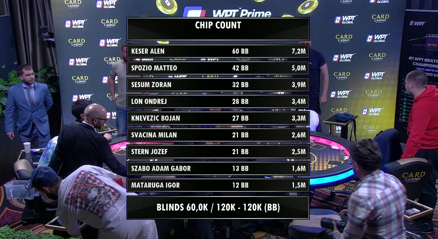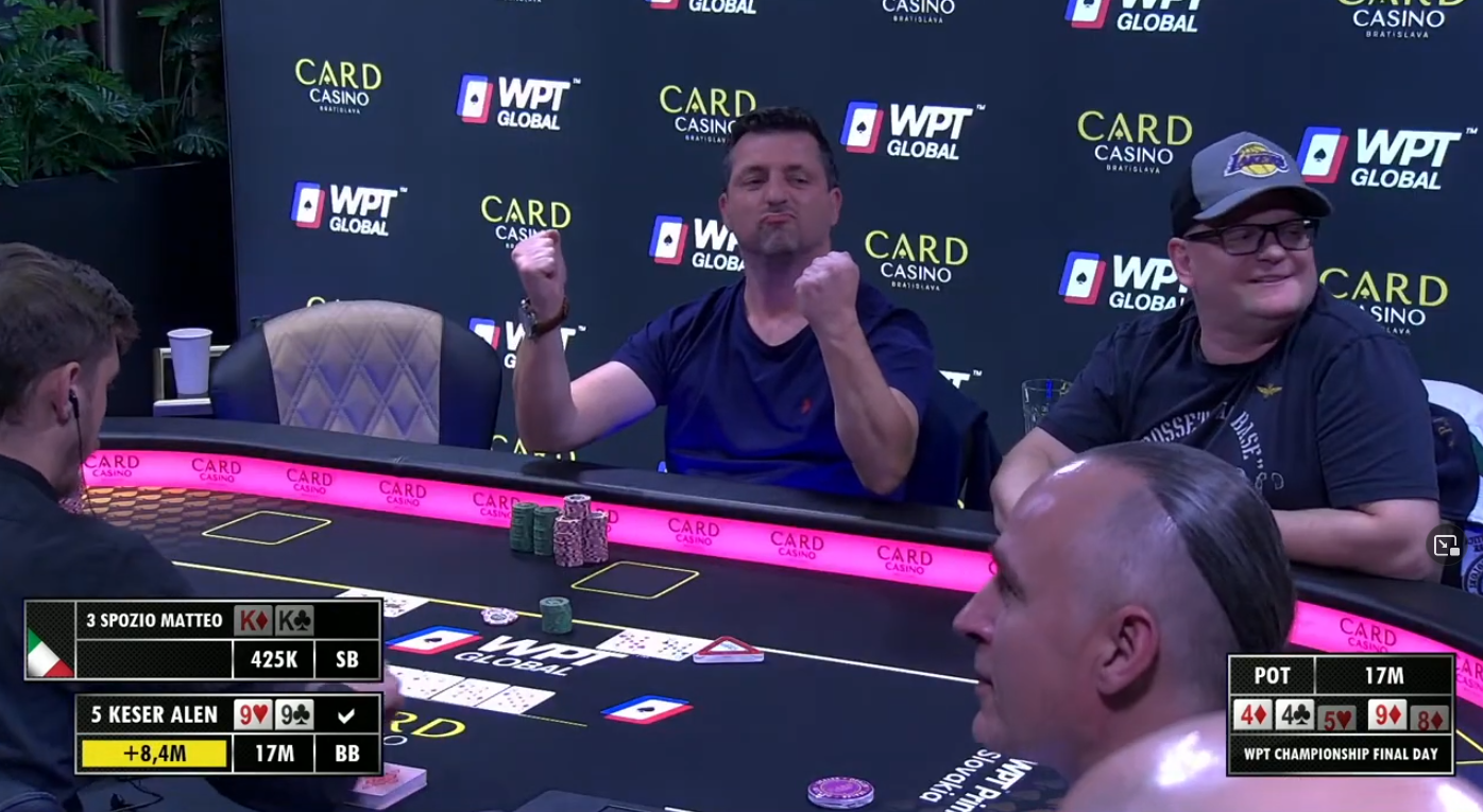 Videli smo lahko vse kar krasi poker, aktivno igro polno zanimivih situacij, bad beatov, agresivnih potez in “namještalk”, med najbolj aktivnimi pa je bil kakopak tudi Alen. Najpomembnejši hand turnirja zanj pa je prišel proti Italijanu Matteu Spoziu, ko sta se igralca znašla all-in pred flopom. Keser je pokazal par devetk, Spozio na drugi strani par kraljev in izgledalo je zelo slabo za Slovenca.