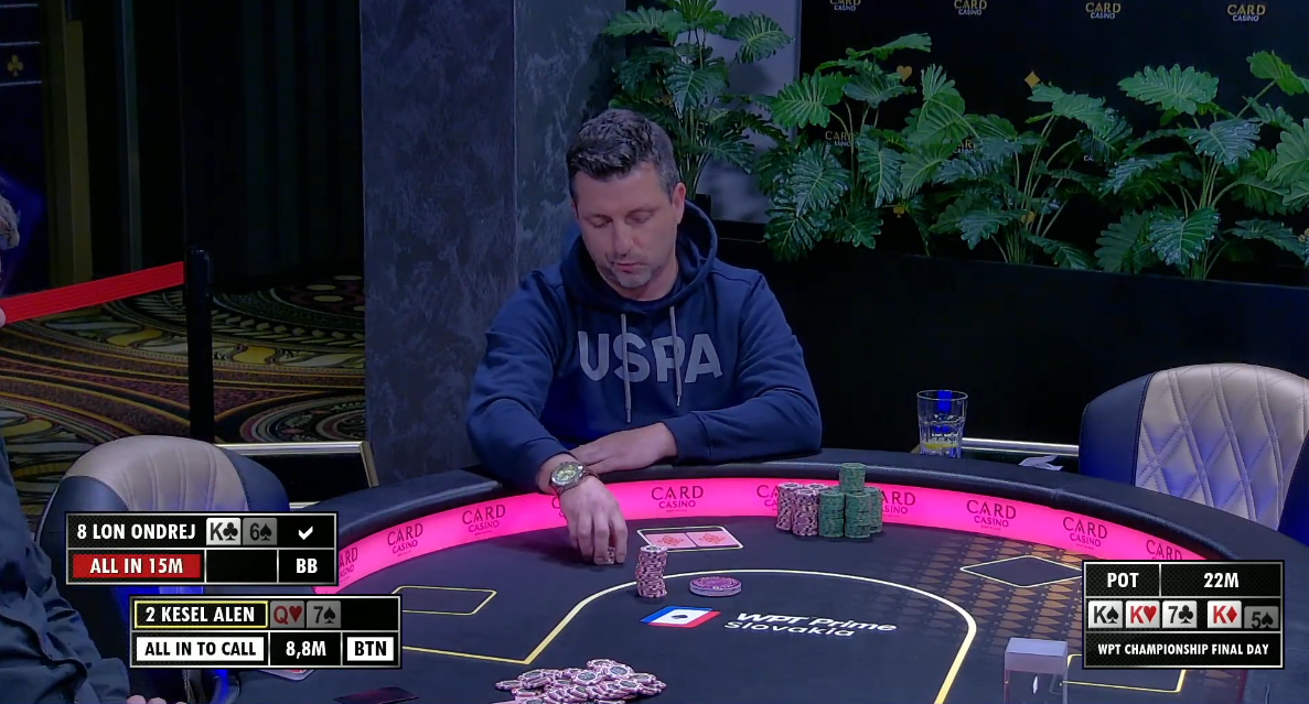 V zadnjem handu pa ni mogel ubežati drugemu paru proti top paru Čeha in tako WPT Bratislava Championship končal na odličnem drugem mestu za 29.500 €, Ondřej Lón pa je lahko nazdravil še enemu odličnemu rezultatu v svoji bogati karieri, ki mu je navrgla že preko 750.000 $ turnirskih nagrad.
