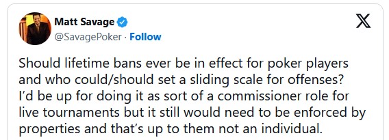 Zanimivo razmišljanje o tej temi je podal tudi izvršni direktor turneje WPT Matt Savage. Opozoril je na vprašanje, kako dolgo naj izključeni igralci dejansko ostanejo izključeni, in spomnil, da so nekateri, ki so bili v preteklosti obtoženi ali izločeni zaradi igranja z več računi na poker straneh, danes med najuspešnejšimi poker igralci.