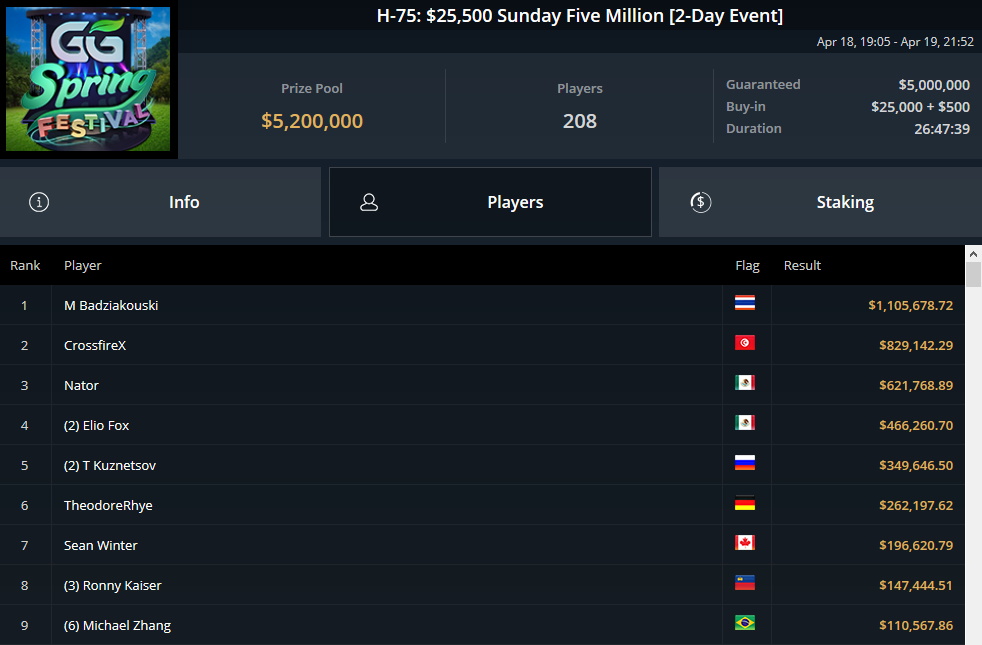GG Spring Festival 2021 na GG mreži (GGPoker, Natural8, 2bet4win) je podelil še več prvakov v igrah z visokimi vložki. Mikita Badziakouski si je prislužil drugo največjo posamično nagrado v seriji doslej. Badziakouski je med 208 prijavljenimi na turnirju H-75: 25.500 $ Sunday 5 Million odnesel levji delež nagradnega sklada 5,2 milijona dolarjev in odšel z glavno nagrado v višini 1.105.679 $.