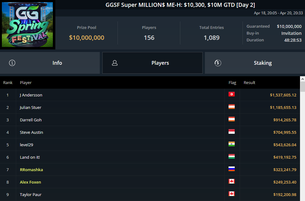 Največja posamična nagrada med tekočim GG festivalom je bila podeljena na rekordnem GGSF Super MILLION$ ME-H: 10.300 $. Ta ogromen turnir na GG-ju je zbral neverjetnih 1089 prijav, 125 igralcev pa je zaslužilo delež nagradnega sklada 10.890.000 $. Joakim Andersson si je prislužil največjo zmago v njegovi karieri.