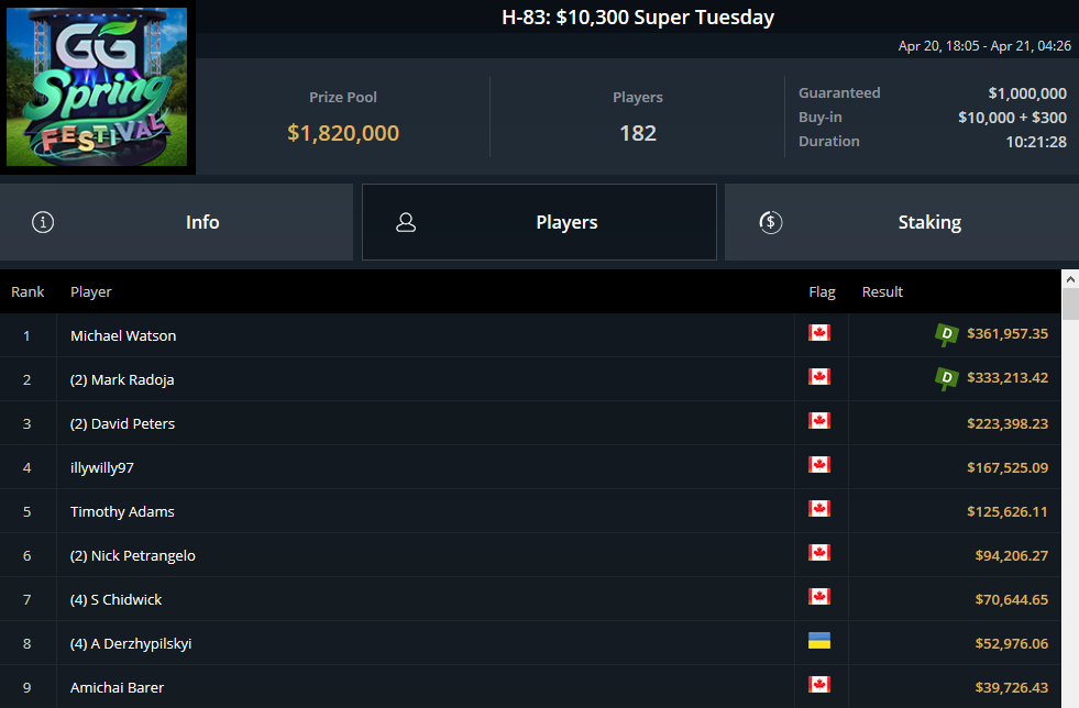Končal se je tudi 10.300 $ Super Tuesday. Mike Watson in Mark Radoja sta se pred začetkom heads-up obračuna dogovorila, da si bosta razdelila preostal nagradni sklad, Watson pa je odnesel večjo nagrado in tudi postal zmagovalec.