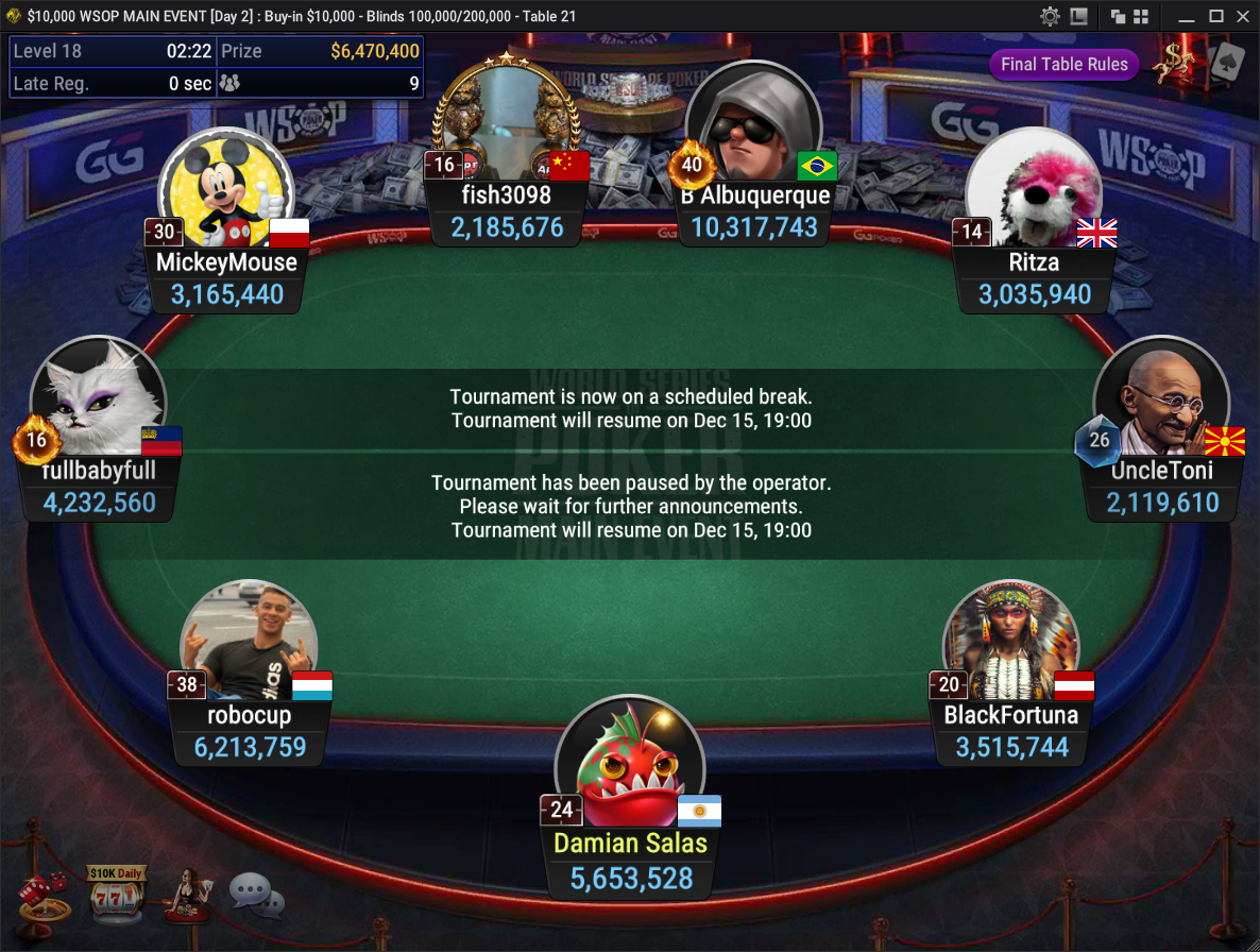 Po 10-ih urah pa se je izoblikovala tudi finalna miza devetih, ki se bo srečala v igri v živo. 15. decembra v češki Rozvadov tako potujejo vodilni Brazilec Brunno “B Albuquerque” Botteon, Portugalec Manuel “robocup” Ruivo, Argentinec Damian Salas, ki je bil leta 2017 že 7. na WSOP Main Eventu, neznani Lihtenštajnec, Avstrijec Hannes “BlackFortuna” Speiser, Litovec Dominykas “MickeyMouse” Mikolaitis, Španec Ramon “Ritza” Miquel Munoz, Kitajec Peiyuan “fish3098” Sun in Bolgar Stoyan “UncleToni” Obreshkov.