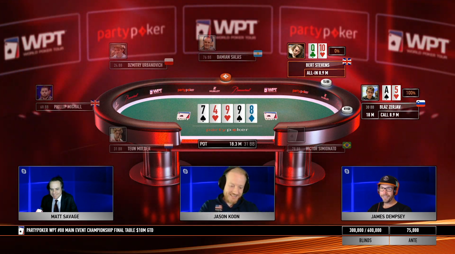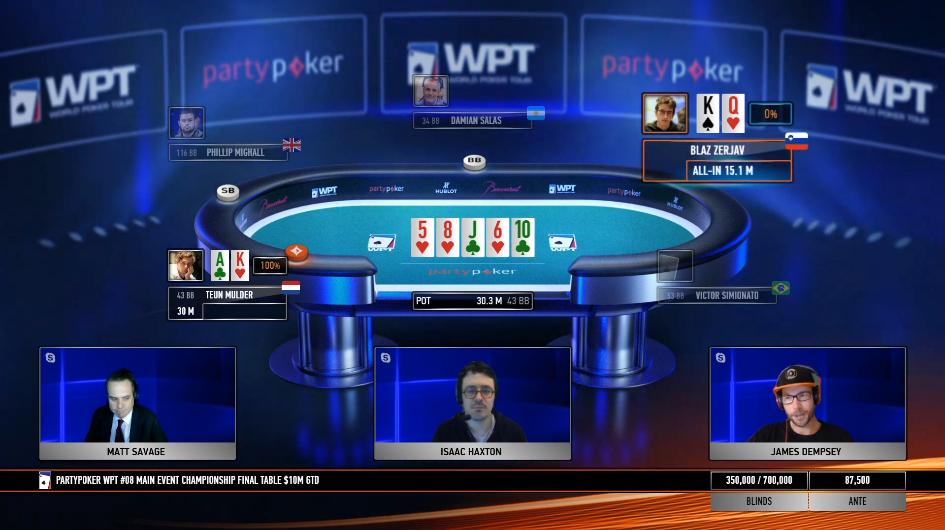 Na drugi strani pa ni uspel blef Brazilca Simionata, ki je s QJ porinil na riverju proti Blaževi lestvici, ki je tako praktično izločil še enega igralca, čeprav mu je teoretično ostalo še nekaj žetonov, ki pa so izpuhteli že v naslednjem handu.