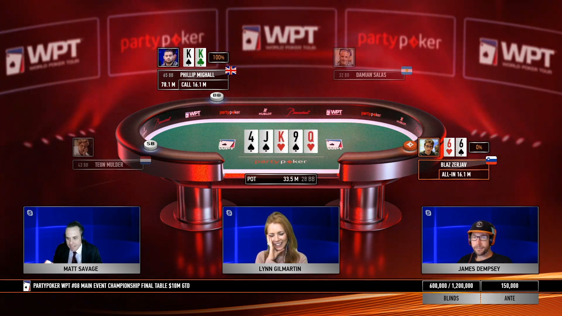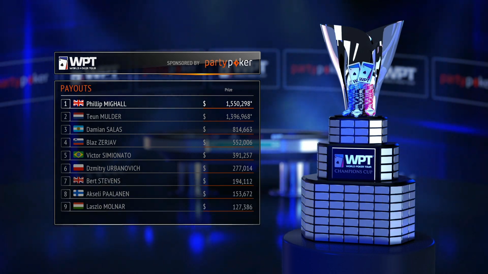Na tretjem mestu na WPT glavnem turnirju je končal Argentinec Damian Salas, Britanec Mighall in Nizozemec Mulder pa sta naredila heads up deal, kjer sta pustila 100.000 za zmagovalca.