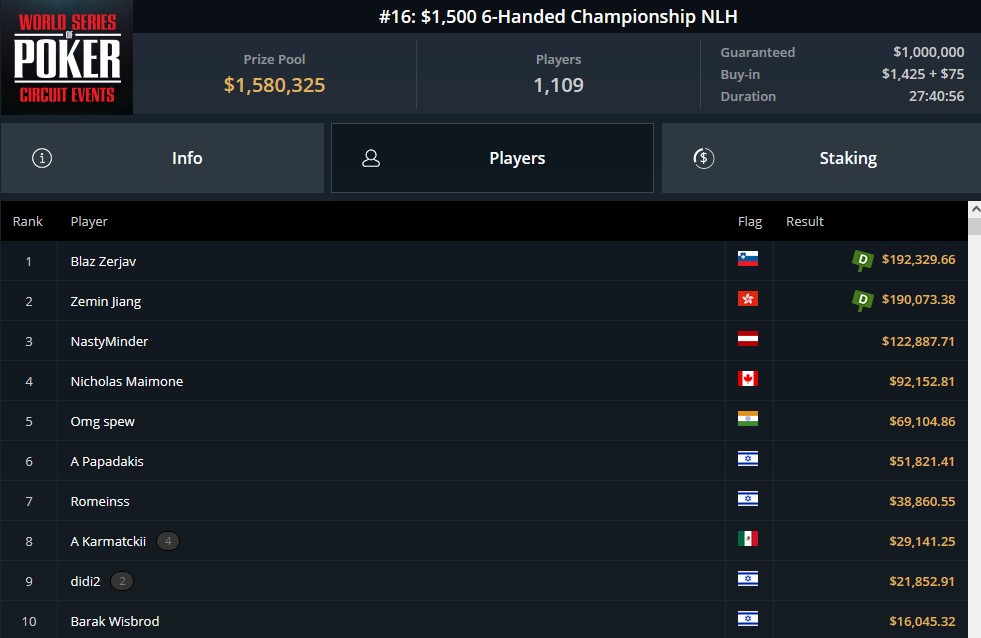 Blaž je svoje znanje izkoristil na dogodku #16: $1,500 6-Handed Championship NLH, kjer je po dogovoru z Vietnamcem Zeminom Jiangom, prejel 192.329 $ denarne nagrade, odigrala pa sta še heads-up za končno lovoriko, ki je tudi pripadla našemu asu in Žerjav se je lahko veselil enega svojih, in tudi slovenskih, največjih dosežkov.