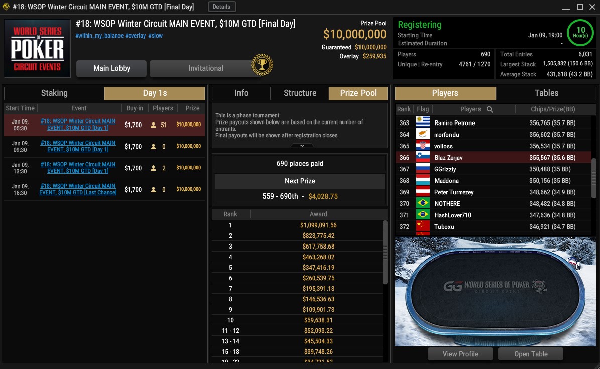 V teh dneh na GG mreži (GGPoker, Natural8) poteka WSOP Winter Circuit serija, ki se zaključuje danes zvečer s finalnim dnem glavnega dogodka. Poleg cele kopice stranskih turnirjev, je bilo organiziranih 18 osrednjih turnirjev, kjer so se delili WSOPC prstani.