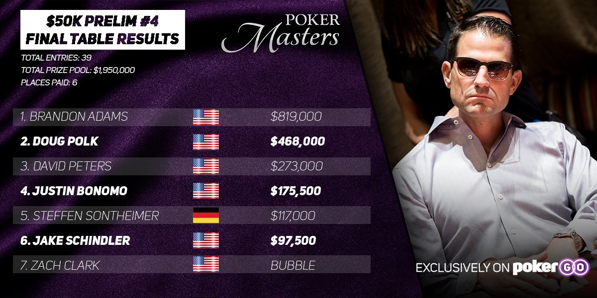 V četrtem začetnem $50.000 turnirju smo na finalki videli tri povratnike – Douga Polka, Jakea Schindlerja in vodilnega Sontheimerja, ki bi lahko svojo prednost močno povečal, a je končal na 5. mestu z le 117.000 dodatnimi dolarji za skupno lestvico. Za zmago sta se udarila Brandon Adams in popularni Doug Polk. V zadnjem handu je Polk porinil s 5