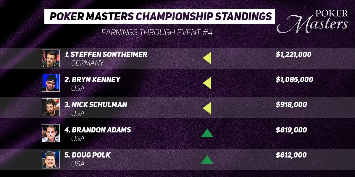 Razlike na lestvici niso velike. Vodi kot že rečeno Steffen Sontheimer, ki je trikrat prišel do denarnih nagrad. Drugi je Kenney z dvema rezultatoma. Tretji še vedno Nick Schulman z zmago na prvem turnirju. Na celotnem spisku je 23 igralcev in marsikdo še vedno lahko upa na končno zmago. Vse se bo torej odločalo na zadnjem petem turnirju – $100.000 Championship. Prvi dan bo na sporedu že danes, s prenosom ponoči ob 2:30. Jutri se bodo igralci vrnili za drugi dan, prenos se bo začel ob 23:30. Nato pa bo v sredo sledila še finalka, s tudi Evropejcem prijaznejšo uro ob 21:30.