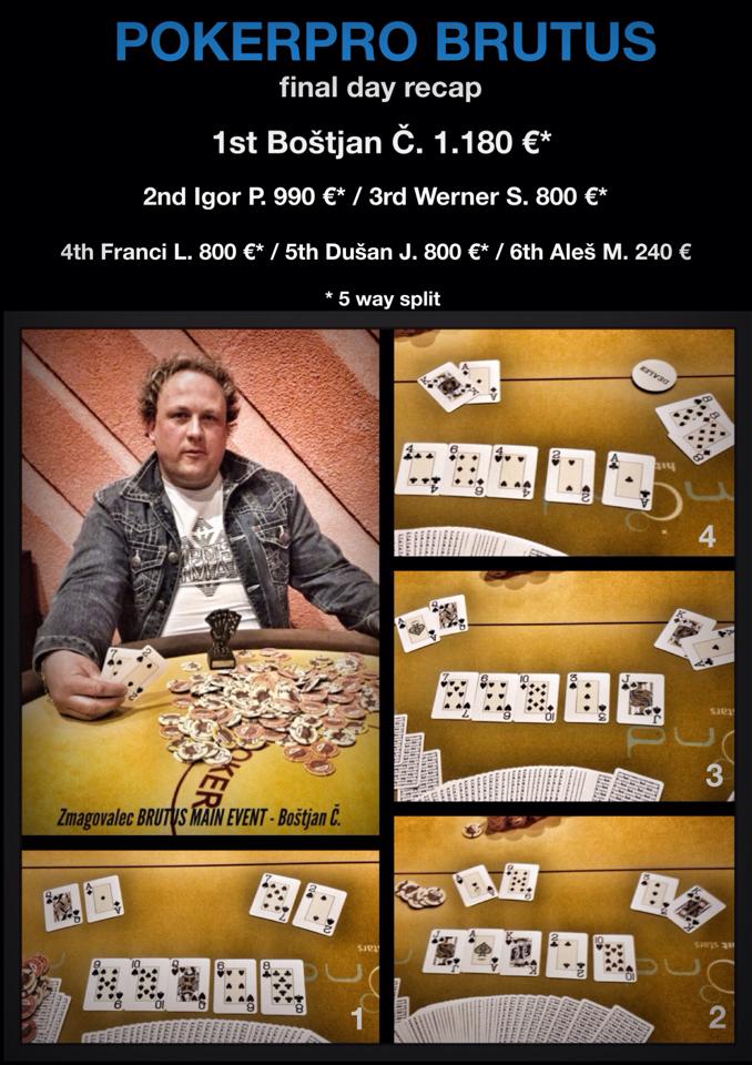 V heads-up sta tako prišla Igor P. ter Boštjan Č., ki je v svojem pohodu izločil že štiri igralce. Zadnja igra večera se je pričela z mini raisom Igorja (AQ) katerega je Boštjan s 72 v piku izenačil (slika 1). Na flopu je prišlo do zapleta saj je z damo Igor dobil najvišji par, Boštjan pa flush draw. Po rahlem premisleku je Igor potisnil all-in katerega je Boštjan nemudoma izenačil. Turn in river sta nato presenetila, saj sta Boštjanu podarila lestvico ter zmago na POKERPRO BRUTUS MAIN EVENTU.