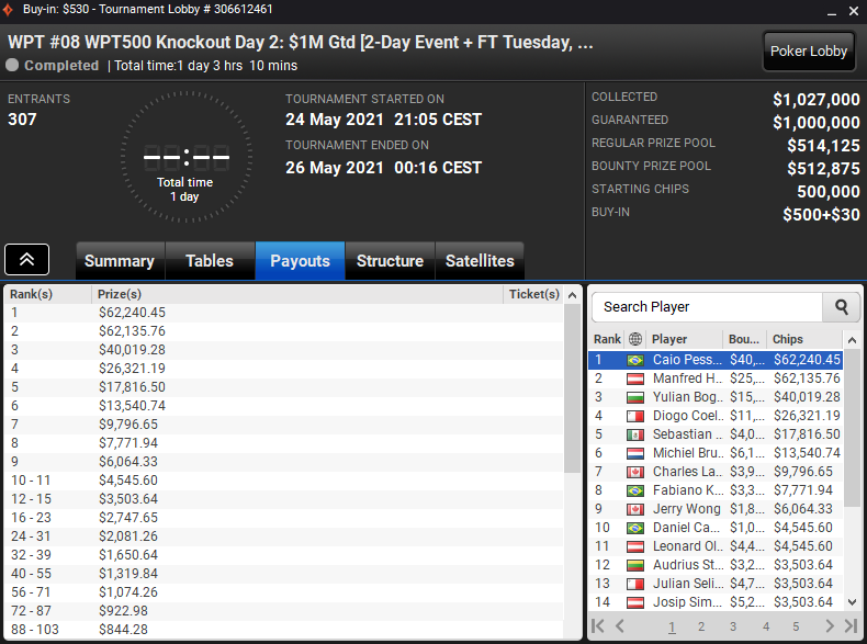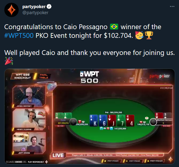 Končal se je eden največjih letošnjih turnirjev na WPT Online Series na partypokru. Po treh tekmovalnih dneh je Caio Pessagno še enkrat pokazal, zakaj je ena največjih legend brazilskega pokra. S kariero, ki traja že več kot 15 let, še naprej zbira odlične rezultate na največjih spletnih straneh za poker. Brazilski poklicni igralec pokra je domov odnesel odlično nagrado za prvo mesto v vrednosti 102.704 $.