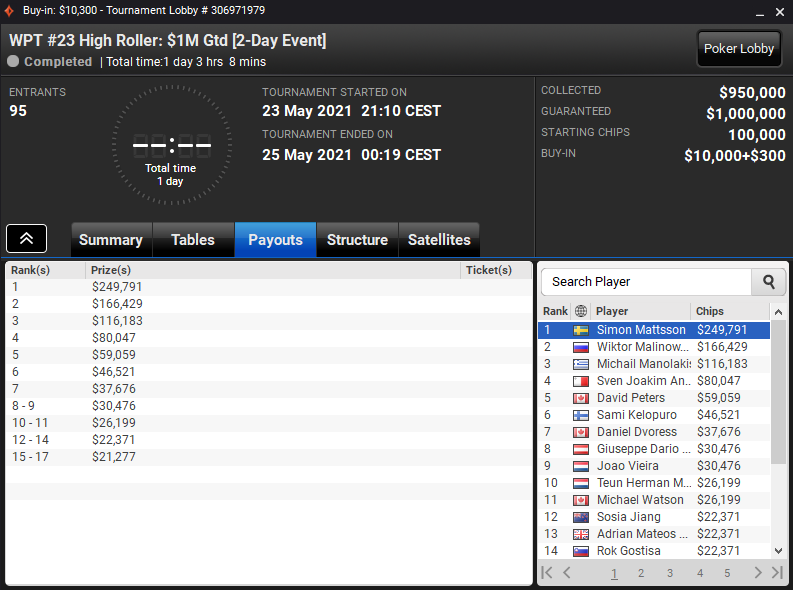 Simon Mattsson osvojil WPT Online Series #23: 10.300 $ WPT High Roller