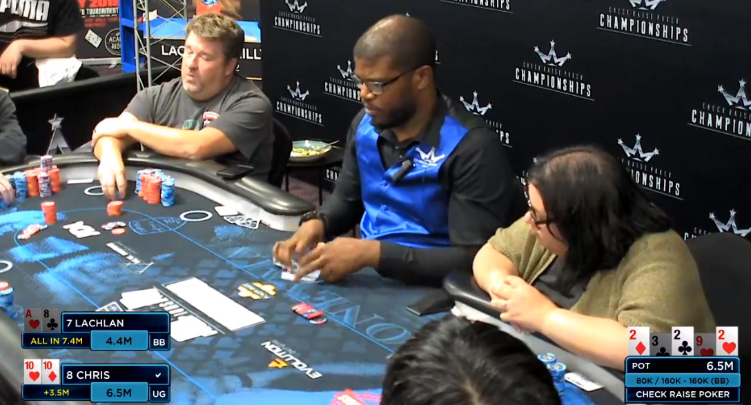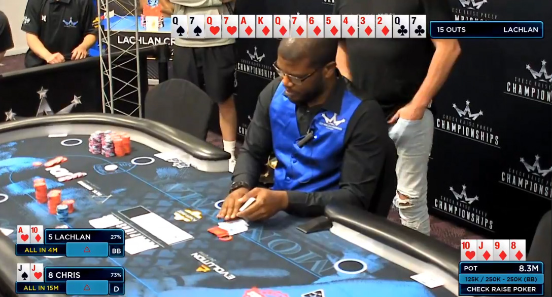 Heads-up je Američan začel s skoraj 4:1 vodstvom v žetonih in turnir precej udobno pripeljal do konca. Zadnji hand se je odigral kar sam, ko je Chris imel JJ, Lachlan pa v roki ATo, vsi žetoni pa so seveda končali na sredini. Flop se je odprl TJ9 in zdelo se je, da je že vsega konec, toda turn 8 je nasprotniku prinesel vlečko barvne lestvice in kar 15 outov.