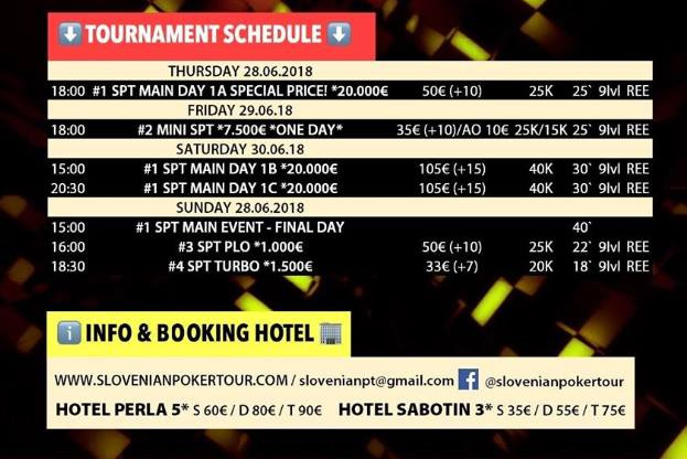 Poletna edicija SPT-ja bo trajala od četrtka 28. junija do nedelje 1. julija, na sporedu pa bodo klasični štirje turnirji, z dostopnimi prijavninami od 40 do 120 €. V Perli bodo seveda ponovno poskrbeli za lep obisk, organizatorji pričakujejo okoli 30.000 € skupnega nagradnega sklada.