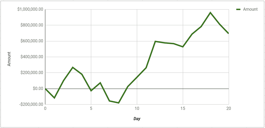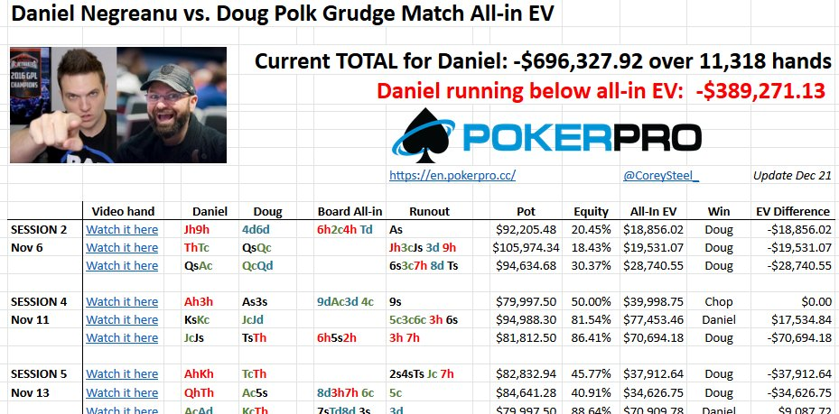 Seveda je Polk še vedno v veliki prednosti s +696.327,92 $, ampak glede na all-in EV, bi moral Doug biti v plusu “le” 8 buyinov, med tem ko se približujeta sredinski točki boja. Daniel je namreč v all-in spotih izgubil skoraj 10 buyinov več kot po EV-ju.