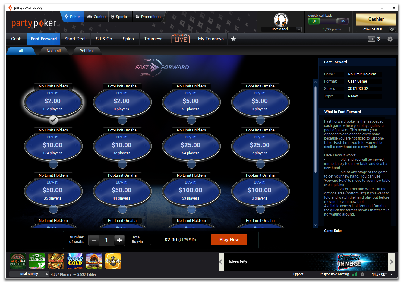Z novo nadgradnjo je partypoker uvedel poseben zavihek za Fastforward igre. Sedaj boste z lahkoto in zelo hitro izbrali vaše najljubše mize. Zavihek je zelo podoben zavihkoma za SPINS turnirje in Short Deck poker.