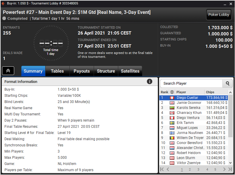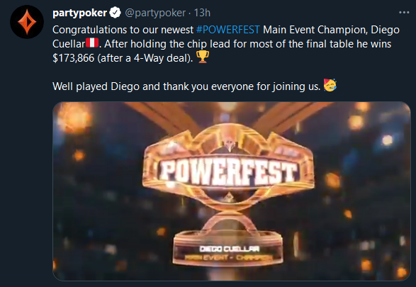 Kralj festivala POWERFEST na partypokru je Perujec Diego Cuellar, vodilni pred začetkom finalne mize. Na poti sicer ni izločil nikogar, a je kljub vsemu po 4-way splitu domov odnesel največjo nagrado na turnirju. Priskrbel si je 173.867 $ in postal prvak Partypoker Powerfest Main Eventa. Vsi ostali trije igralci v dogovoru so domov odnesli tudi več kot 150.000 dolarjev.