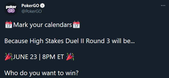 Phil Hellmuth in Daniel Negreanu se bosta pomerila v 3. krogu dvoboja High Stakes 23. junija, kar bi lahko bila njuna zadnja bitka, saj Hellmuth lahko odide s 350.000 $, če zmaga še tretjič.