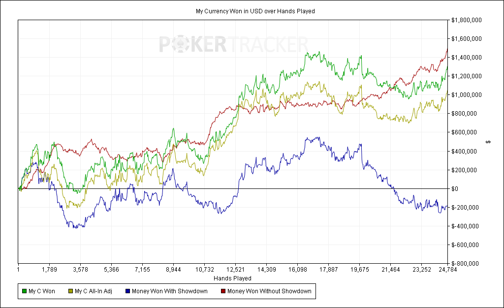 Če pa pogledamo modro linijo, ki nakazuje Profit s showdownom, pa vidimo, da je Polk dejansko v rdečih številkah. Ta statistika kaže vse hende, ki so šli do showdowna, tudi tiste ki jih nismo mogli pokrili v naši All-In EV preglednici.