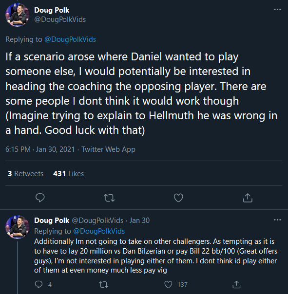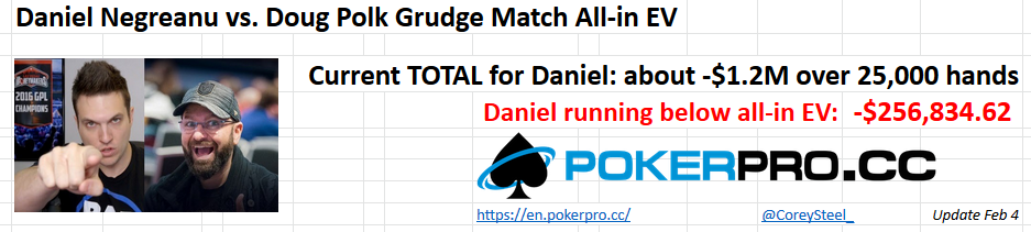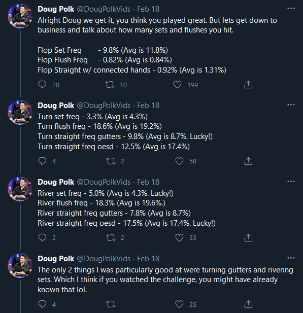 Doug Polk je na Twitterju objavil obsežno statistiko svoje 1,2$ milijonske zmage proti Danielu. Dvoboj se je začel novembra 2020 in končal 4 mesece ali 25k hendov kasneje 3. februarja, 2021.