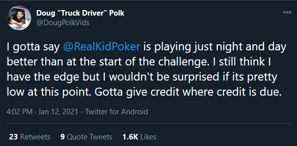 Doug je bil spredaj celoten session, največ že za 176.000 $, vendar je Danielu uspelo prilesti nazaj in na neki točki je zaostajal le pol buy-ina. Nato pa je, glede na izjave v intervjuju po končani igri, sledilo nekaj nesrečnih handov, ki so zadele Polka in spet je bil ta spredaj 3 buy-ine. Dan je končal pri +119.609,84 $ in s tem praktični izničil ponedeljkovo izgubo v višini 132k $.