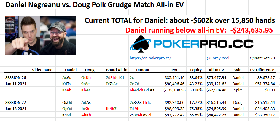 Kljub temu je Daniel še vedno na tempu, kjer bi mu 1 buy-in (40.000 $) na dan prinesel povratek in zmago v tem dvoboju za čast in slavo. Premagati mora le 603.683,77 $ velik deficit v naslednjih približno 15-ih igralnih dneh oziroma 9.150 handih. Zato pa mu toliko bolje kaže v all-in EV statistiki, kjer pa zaostaja “le” 360.047,84 $.