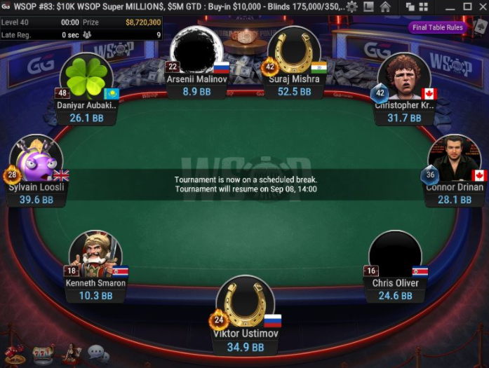Letošnje WSOP prvenstvo se je končalo 6.9.2020, razen za 9 igralcev, ki so ostali na finalni mizi eventa #83 $10.000 WSOP SUPER MILLION$. Turnir je bil pavziran in se je ponovno nadaljeval včeraj ob 14:00. Tako se je v boj za zadnjo zapestnico podalo 9 igralcev iz šestih različnih držav. Trije igralci iz ZDA, dva igralca iz Rusije in po en igralec iz Indije, Francije, Kazahstana in Kanade.