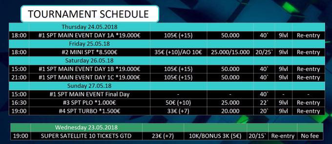 Od 23. do 27. maja naš čaka klasičen nabor štirih različnih turnirjev – 45€ Mini, 60€ PL Omaha, 40€ Turbo in seveda glavni 120€ Main Event, ki se z dnevom 1A začne v četrtek 24., druga dva prva dneva 1B in 1C pa sta na sporedu v soboto 26.