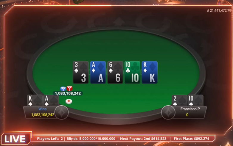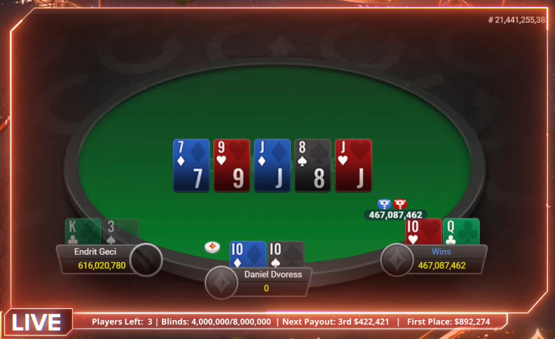 River K in Endrit je šel all-in z dvema paroma, Francisco pa v trenutku klical s svojim parom T in Endrit Geci je postal prvak MILLIONS Online Main Eventa 2021.