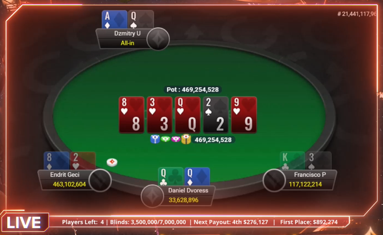 Četrti pa je bil član partypokrove ekipe Team Online Dzmitry Urbanovich, ki se je zaletel z AQ proti Dvoressovim parom kraljic.