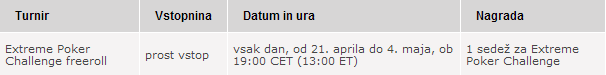 Vsak dan od do 4. maja bo PokerStars podelil en sedež za Extreme Poker Challenge. Na dnevne turnirje, ki potekajo ob 19:00 CET, se lahko prijaviš pod zavihkom ‘Turnirji’ > ‘Regionalni’. Vsi turnirji so na voljo le igralcem iz Slovenije.