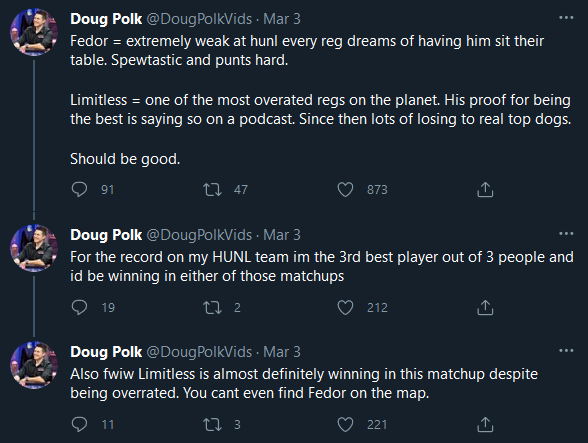 Seveda takšnega dogodka ne more spregledati Doug Polk, ki je oba igralca in njuno heads-up igro še pred začetkom obračuna raztrgal, pozneje pa Fedorja in Wiktorja obtožil, da sta priredila tekmo. Bil je tako razočaran nad nivojem igre, da je predčasno zaključil poročanje med prvo sejo igre, češ da ga je (ne) kvaliteta igre užalila že na samem začetku. Svojo nejevernost je seveda takoj prestavil na Twitter in sprožil ‘zanimivo’ anketo.