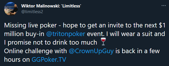 Mogoče pa je ‘Limitless’ slabo igral nalašč, da bi bil le povabljen na naslednje Triton turnirje, saj ga na zadnji milijonski dogodek, kjer je vsak poslovnež lahko izbral enega profesionalca, ni povabil nihče.
