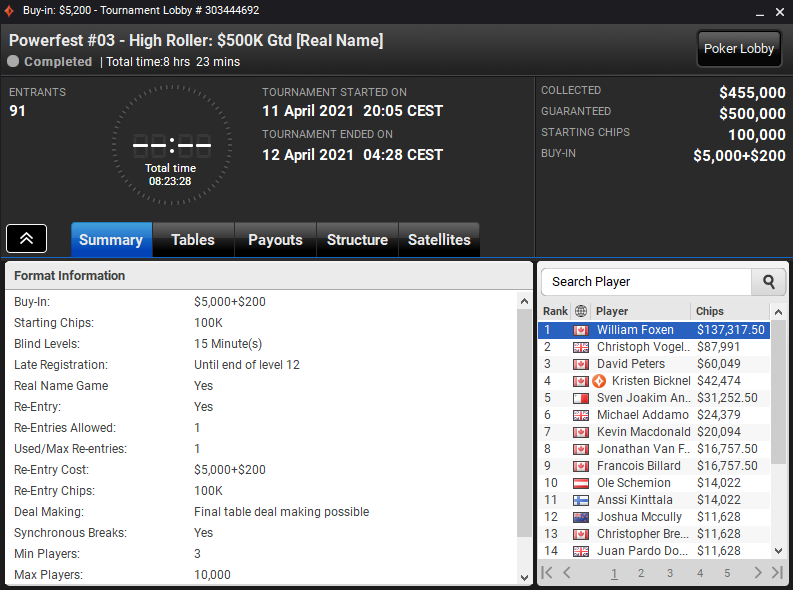 91 igralcev je vplačalo vstopnino za 5200 $ POWERFEST # 03 – High Roller dogodek in le 14 jih je odšlo z deležem 500.000 $ nagradnega sklada. Vsak, ki je prišel v nagrade, si je zagotovil najmanj 20.094 $. Kristen Bicknell se je uvrstila na četrto mesto in odnesla 42.474 $, David Peters pa je bil izločen na tretjem mestu, vrednem 60.049 $. Foxen je premagal Vogelsanga heads-up in si zagotovil 137.317 $, Vogelsanga pa pustil z 87.991 dolarji ‘tolažilne nagrade’.