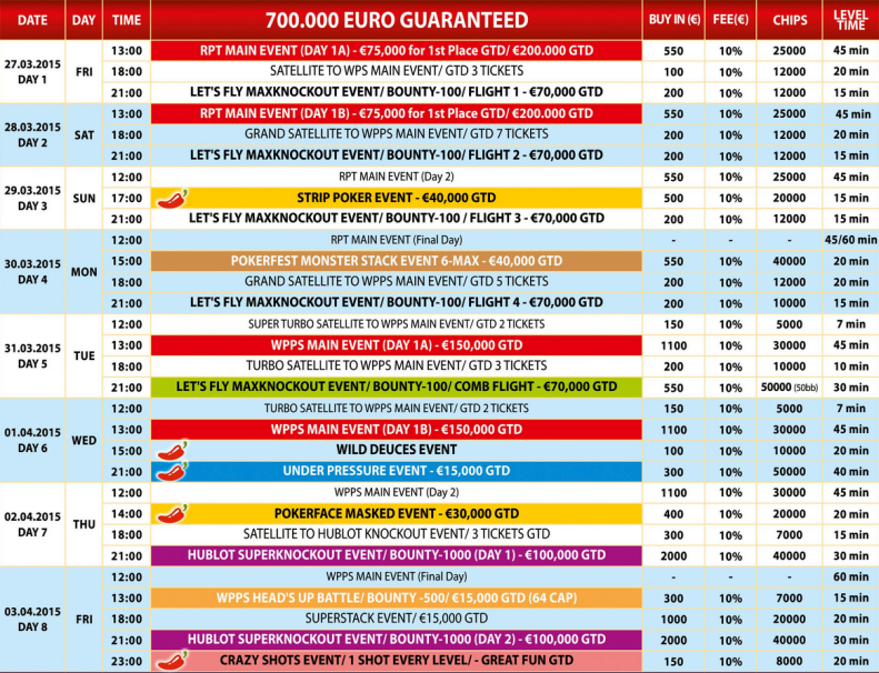 Festival bo privabil ogromno število igralcev iz vse Evrope, ki se bodo poleg glavnega dogodka lahko pomerili tudi na različnih stranskih turnirjih in cash game mizah. Razpon buy-inov je zelo širok, zato bo zagotovo vsak našel kakšen zanimiv turnir zase.