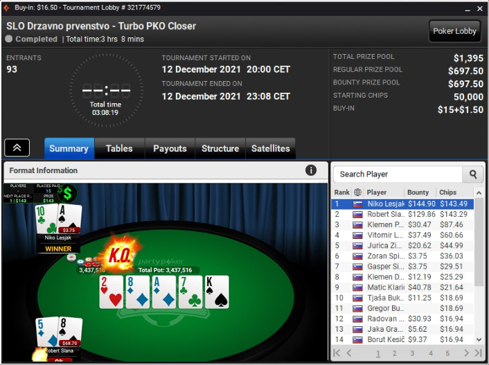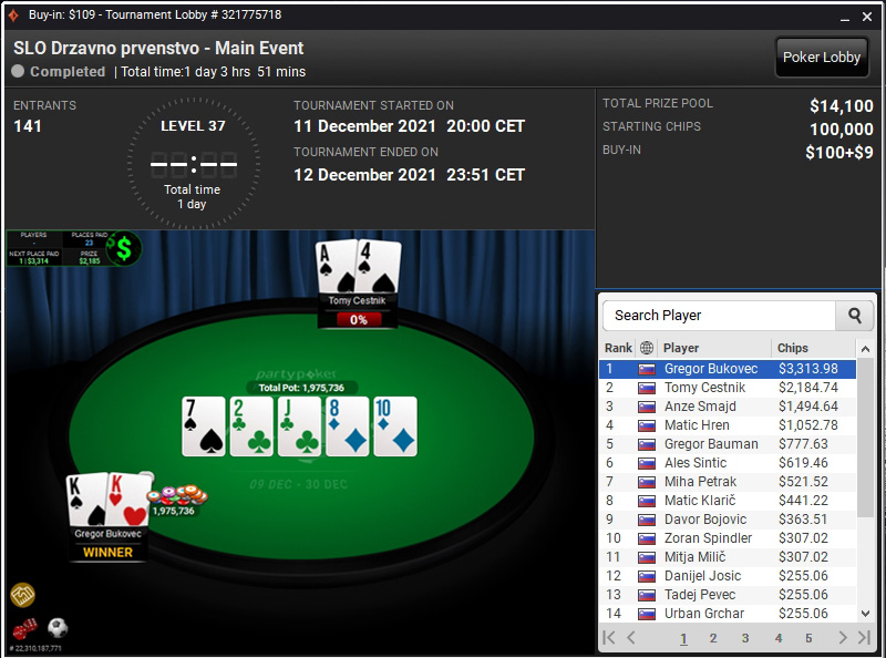 Večino finalne mize je bil v vodstvu Robert Slana, ki je že imel na mizi tudi izločitev Nika Lesjaka, vendar je par desetic zdržalo proti KJ. Vse pa se je končalo že v naslednjem handu, ko je bil Slonek neuspešen s 58 proti AT Lesjaka. Niko je bil na finalki tudi edini brez nagrade za izločitve, tako da je ta zadnja prišla ravno ob pravem času. Čestitke!