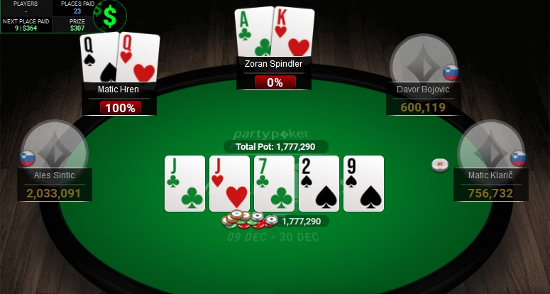 Finalno mizo smo dobili po uri in 15 minut igre, ko je Matic Hren na 10. mestu izločil Zorana Špindlerja in tako tudi povedel v žetonih. Vodstvo je bilo sicer krajše narave, saj je kmalu nato izpadel Davor Bojovič, katerega krvnik je bil Bukovec. Davorjevi žetoni in pa double up Anžeta Šmajda proti Hrenu so bili dovolj, da je bodoči prvak prišel v vodstvo, katerega (praktično) ni spustil vse do konca.