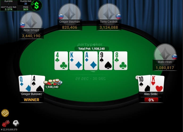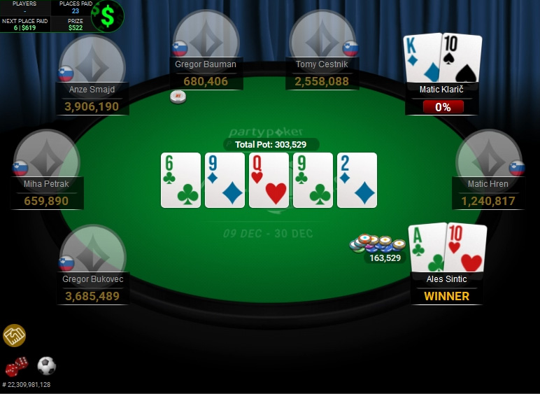 Matic Klarič je bil najkrajši za mizo in mu očitno ni uspelo najti dovolj dobrega handa pravočasno, saj je bil primoran biti all-in na big blindu s KT, Aleš Sintič je pokazal AT in izločil Matica na 8. mestu.