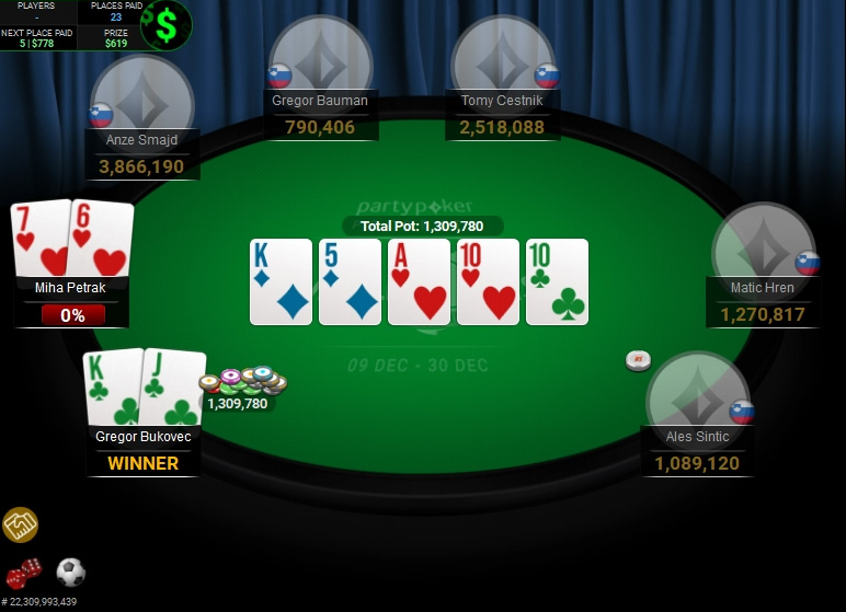 Naslednji je izpadel Miha Petrak, ko je poklical all-in Bukovca z big blinda proti small blindu. S 76s je še dobil nekaj upanja na turnu, a KJ je vseeno zdržal. Tudi naslednja žrtev je bila Gregorjeva, AQ premočan za Alešev KT.