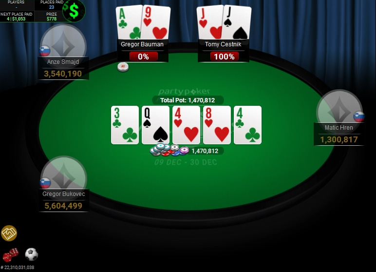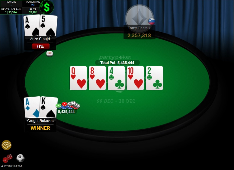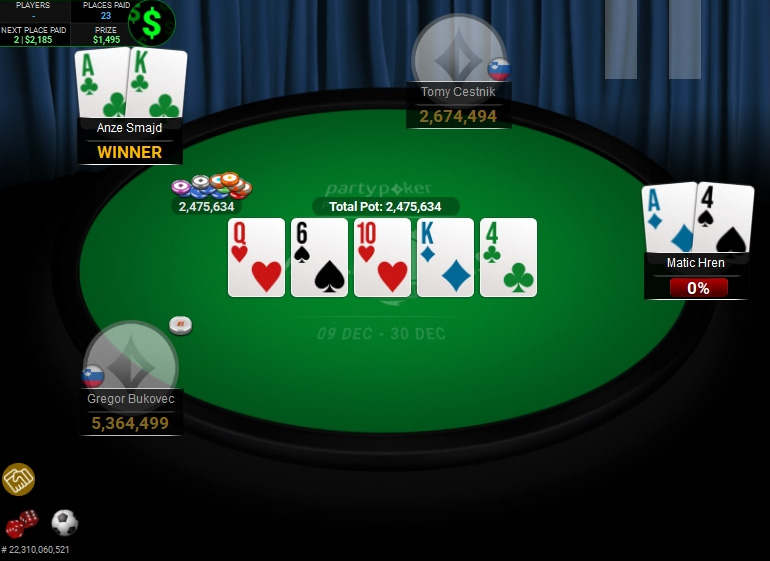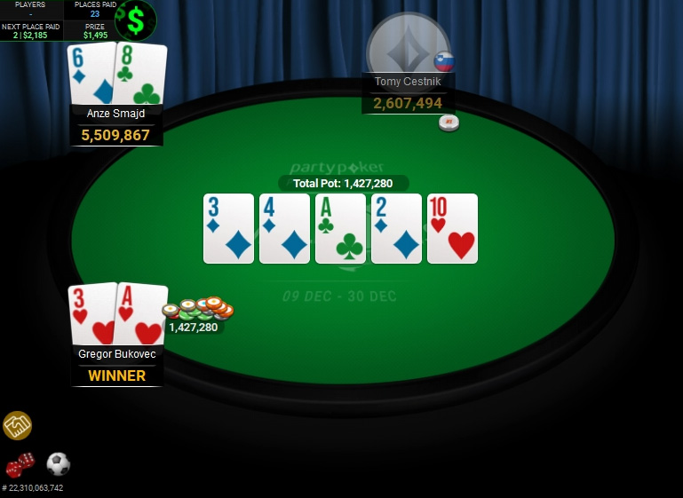 Od te točke dalje je Gregor suvereno manjšal stacka nasprotnikoma, vmes sicer izgubil all-in s QQ proti Tomyevim AK, a se je vseeno zdelo, da je imel 3-way pod kontrolo. Na tretjem mestu je izločil tudi Šmajda, ki je 4-betal all-in z A5s, Bukovec pa je imel ravno v pravem času ponovno močan hand, ki je zdržal do rivra.