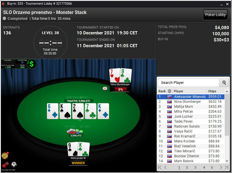 Na Monstru se je zbralo 136 vpisov, po dobrih petih urah in pol igre pa se je naslova veselil Aleksander Miševski, ki mu je v Heads-Upu uspel popoln preobrat proti Nini Stumberger!