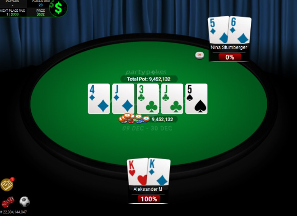 Miševski je iz handa v hand povečeval svojo prednost, Nina je bila že na zadnjih 1,2 milijona, ko ji je uspel še en double up s Q2, naslednji pa na žalost ne, ko je poklicala all-in na turnu, a river ni dal ene od preostalih dveh sedmic.