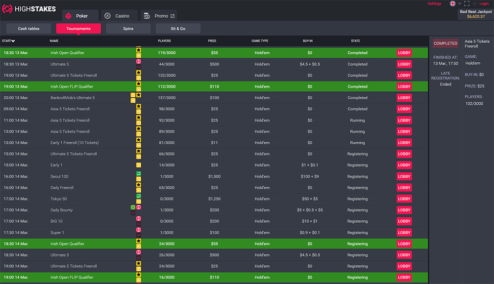 Vsak igralec PokerProja prejme 5 $ BREZPLAČNO na HighStakes, brez obveznosti! Vse kar morate storiti je, da dokončate postopek registracije in se nato obrnete na našo podporo. Svoj brezplačen začetni bankroll lahko uporabite za testiranje akcije na mizah za denarne igre ali se pridružite turnirjem.