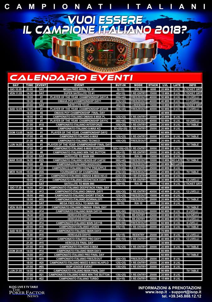 Do 21. maja bo v novogoriški Perli potekalo predzadnje dejanje letošnje ISOP sezone, in sicer Campionati Italiani oziroma italijansko prvenstvo. Čaka nas kopica zanimivih in najrazličnejših turnirjev, med drugimi tudi Win The Button, Omaha Hi/Lo, Crazy Pineapple in drugi. Seveda pa bodo vse oči uprte v 990€ Main Event, ki se začne v petek 18. maja.