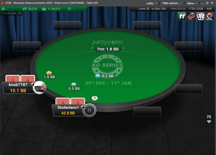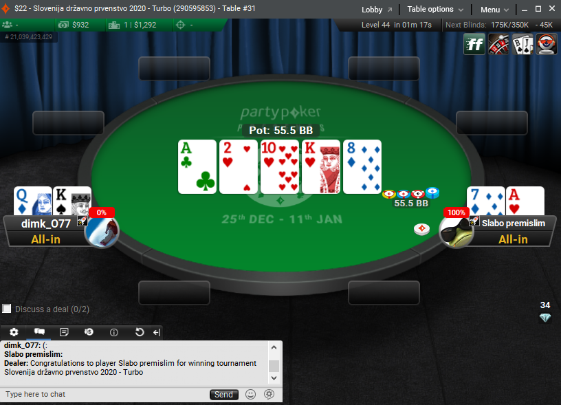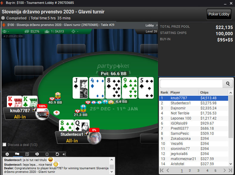 Slednji je začel borbo z veliko prednostjo v žetonih kar 6,5:1, vendar je Jan pokazal neizmerno željo po zmagi, tudi z zanimivim klepetom v chatu partypokra. Zaostanek mu je uspelo topiti iz minute v minuto in z agresivno igro ter kančkom sreče se je tehtnica prevesila na drugo stran.