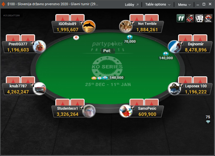 Finalna miza osmih se je izoblikovala po nekaj manj kot petih urah boja. Igra tam pa je zaradi nekoliko hitrejše strukture potekala hitro. To sta znala najbolje izkoristiti Jan “knub7787” Kurinčič in Luka “Studenteco1” Zajc, ki sta se po štiridesetih minutah igre znašla v Heads-Up borbi za naslov prvaka.