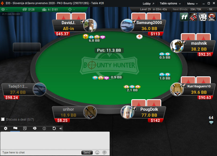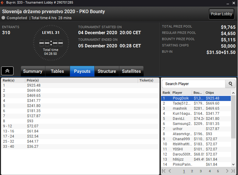 Slavil je Jan “pougdolk” Stražišar, ki je izločeval igralce z mize kot za šalo in si na račun bountyev prislužil 1.336,68 $, poleg tega pa je prejel še $925,48 nagrade za prvo mesto, skupaj tako 2.262,16 $.
