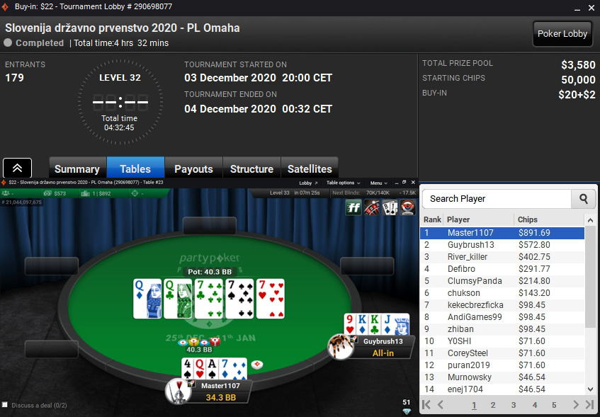 Vsi slovenski ljubitelji pokra s štirimi kartami pa so na svoj račun prišli na 22 $ PL Omaha turnirju.
