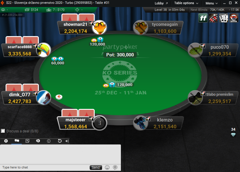 Na finalko osmih je kot vodilni po žetonih prišel scarFace8888, ki pa je imel le 27 big blindov in je na koncu končal kot četrti. V najboljši položaj za zmago pa sta se prebila dimk_o77 in Slabo premislim, slednji pa je imel kar 4:1 prednost v žetonih.