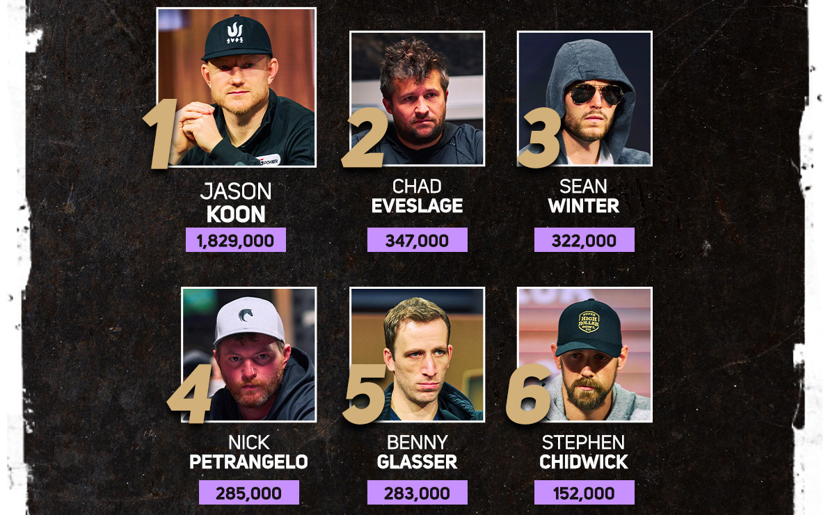 Čeprav je imel Koon petkrat več žetonov kot njegov naslednji tekmec, pa je bil Nick Petrangelo tisti, ki je zadal prvi udarec in to z boljšo flopano barvo od Chada Eveslaga. Naslednji rabelj pa je bil Jason, ki je izločil Stephena Chidwicka na 5. mestu.
